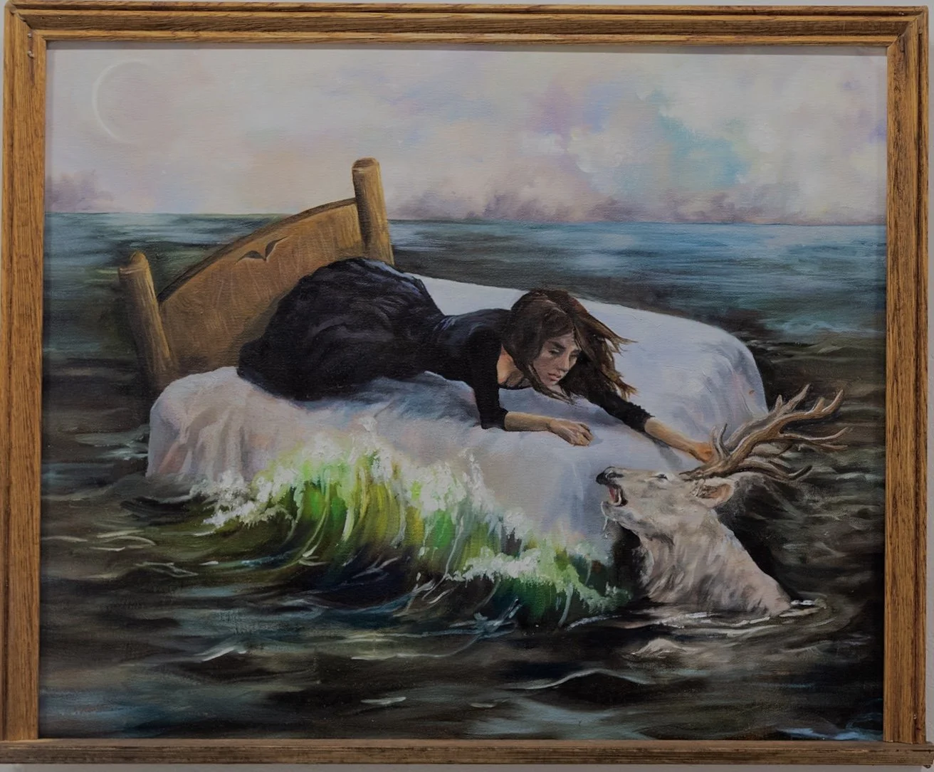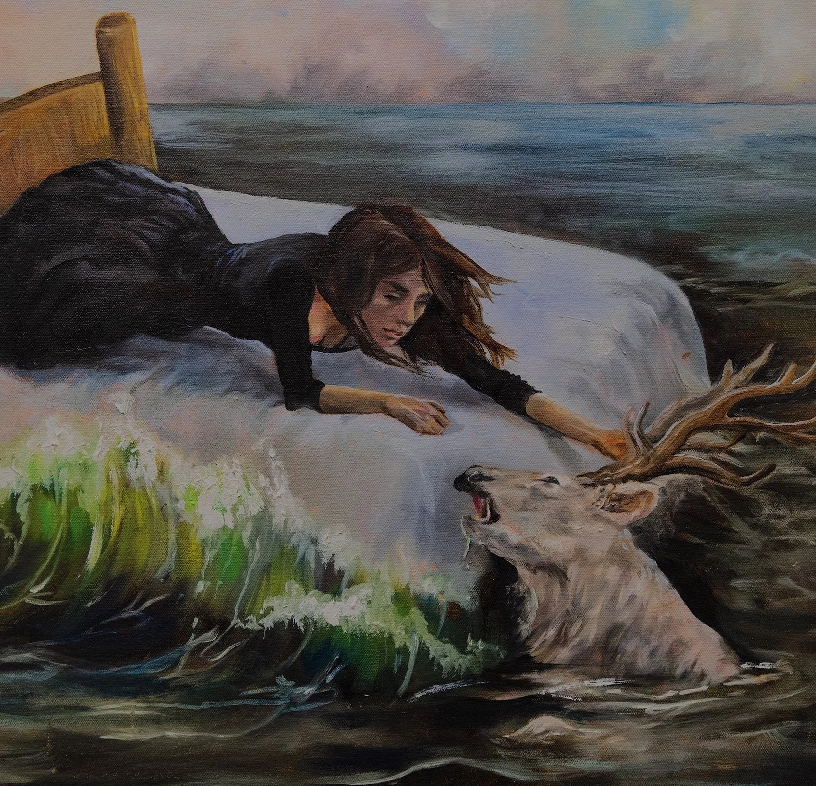 “Saving the Sacred Stag,” oil on canvas, 24x30in + (details)